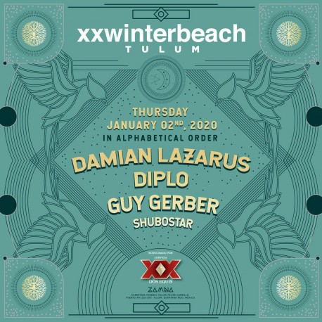 El Nuevo Año 2020 arranca en Tulum el día 2 de enero con el b2b entre Damian Lazarus y Guy Gerber que promete ser un auténtico viaje musical. Además de la esperada actuación de Diplo en formato club, artista norteamericano nominado al grammy y frontman de Major Lazer. Cierra el cartel la artista Koreana que está dando un vuelco a la música electrónica: Shubostar. Una fiesta que tendrá lugar el 02 de Enero de 2020 desde las 22:00 horas en el Cenote Zamna.